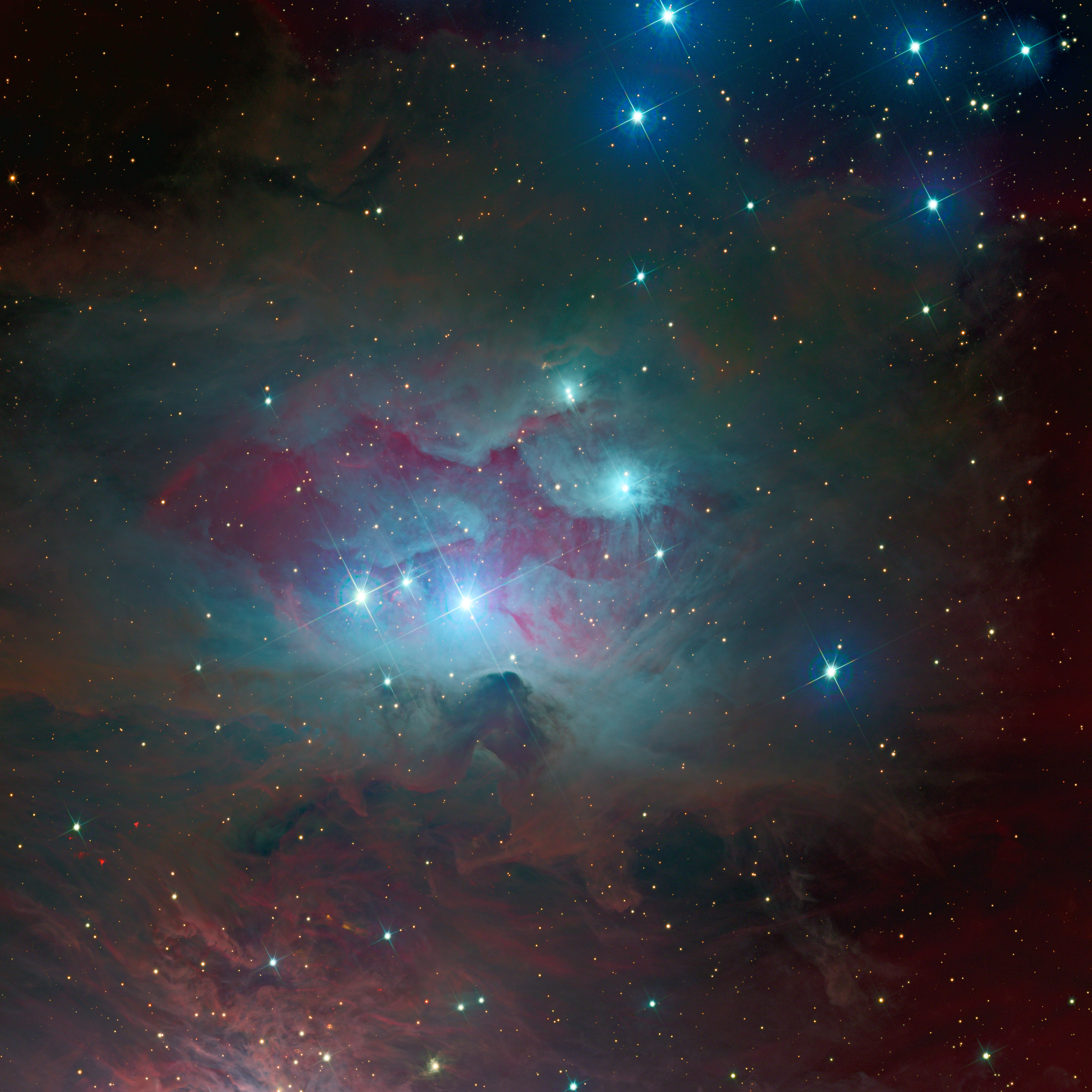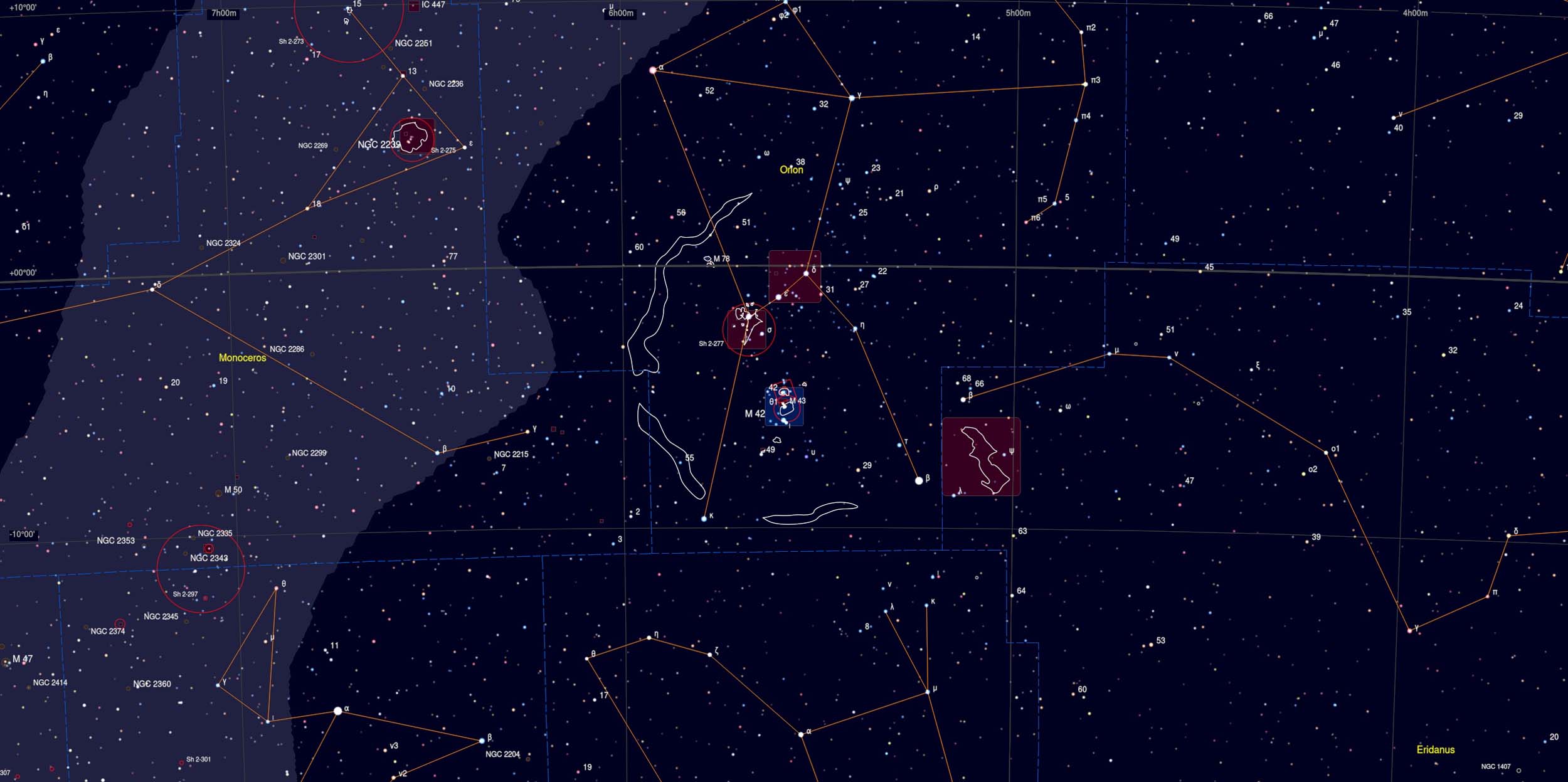 Sh2-279 is an HII region and bright nebulae that includes a reflection nebula located in the constellation Orion. It is the northernmost part of the asterism known as Orion’s Sword, lying 0.6° north of the Orion Nebula. The reflection nebula embedded in Sh2-279 is popularly known as the Running Man Nebula.